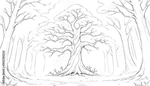 © photoshop #11320770, Fototapeta premium Large tree in forest with bare branches and trunk grass