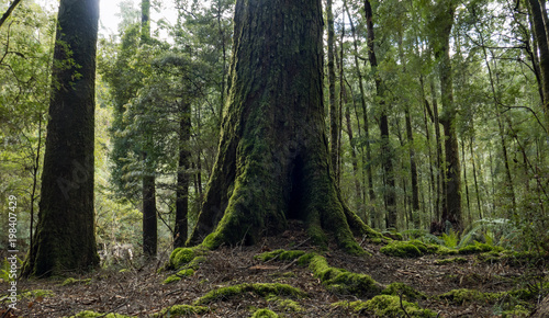 © chrisleeoz, Fototapeta premium Large tree trunk with mossy covering stands tall in old growth and ancient forest, Tasmania Australia.