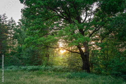 © Sergei, Obraz premium Large tree with a sun shining through its leaves