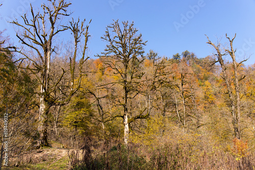 © Борис Масюра, Fototapeta premium Large trees are covered with green moss.