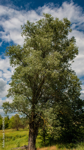 © APHOTOSTUDIO, Fototapeta premium Large trees in a deciduous forest against the blue sky. Vertical panoramic format.