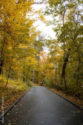 © Cavan, Fototapeta premium Large trees with yellow leaves in a park setting on a fall day.