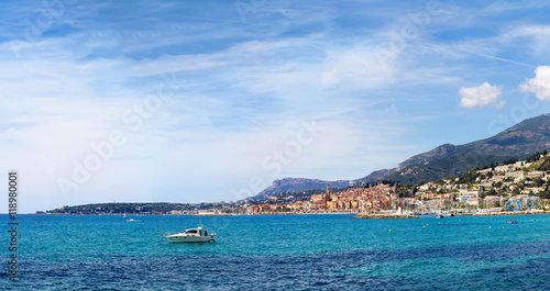 Obraz premium Large view of the Mediterranean Sea and the city of Menton