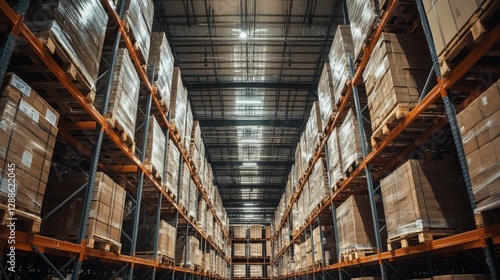 © Tuachan, Obraz premium Large Warehouse Interior Filled with Stacked Boxes and Pallets