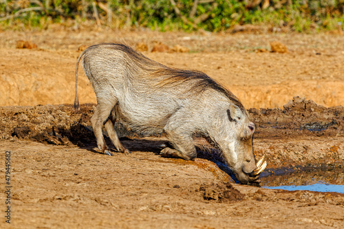 © geoffsp, Fototapeta premium Large Warthog kneeling at waterhole