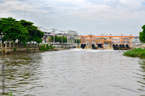 © Wichaiwish, Obraz premium Large water pipe pump flood water and drain, captured with a slow shutter speed.