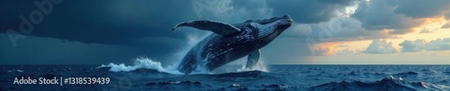 Fototapeta premium Large whale breaching against a dark sky with massive waves and ocean, ocean,...