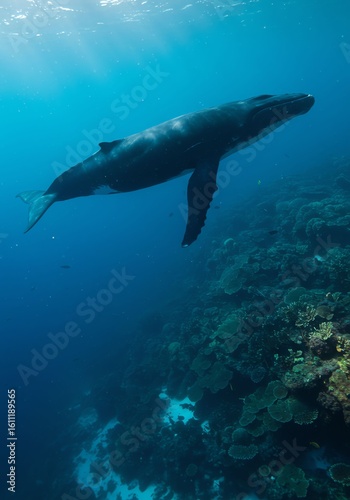 Fototapeta premium Large Whale Swimming Underwater Near Coral Reef in Deep Ocean Scene