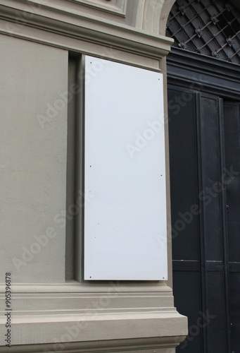 Fototapeta premium Large white billboard banner on an office or storefront mockup. Blank white office or shop sign mock up template.