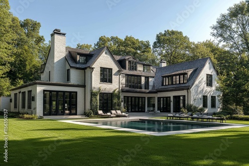 Obraz premium Large white brick modern farmhouse home with black windows, outdoor pool, and...