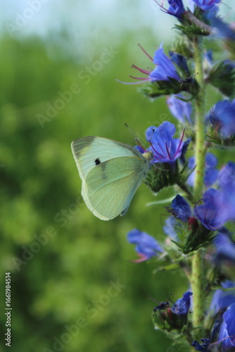 © TomKorcak, Naklejka premium Large white butterfly (pieris brassicae) pollinating viper's bugloss (Echium) medicinal plant against a background of bright meadow herbs and flowers. beautiful purple and blue floral background