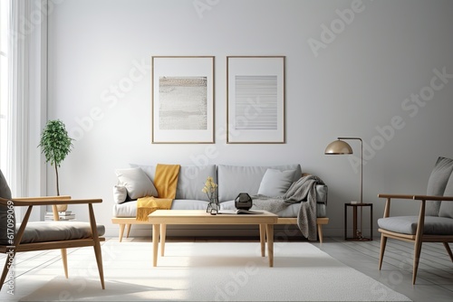 Fototapeta premium large, white living space. Grey sofa and wooden table set, mock up and copy space wall, home design. Generative AI