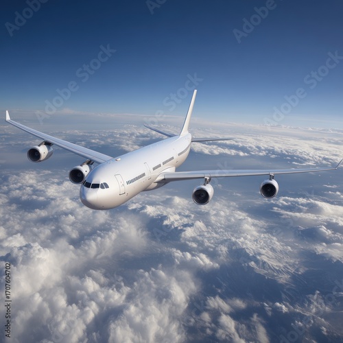 Fototapeta premium Large, white passenger plane soars above a fluffy cloudscape against a blue...