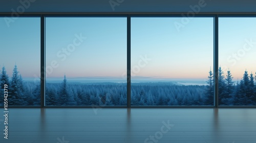 © panumas, Fototapeta premium Large window overlooking a forest with a blue sky in the background. The scene is peaceful and serene, with the trees covered in snow and the sky painted in shades of blue and pink