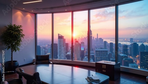 © Raiya, Obraz premium Large windows, panoramic city view from office, design, panoramic