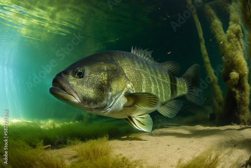 © Edvard Ellric, Fototapeta premium largemouth bass underwater among snags generated by AI