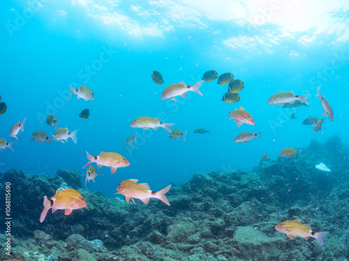 Naklejka premium 美しいメジナ(イスズミ科)、ホウライヒメジ(ヒメジ科)、チョウチョウウオ(チョウチョウウオ科)他の群れ。 英名学名:Largescale Blackfish (Girella punctata), Whitesaddle goatfish (Parupeneus ciliatus), Oriental ButterflyFish (Chaetodon aurites) 中木ヒリゾ浜2024年