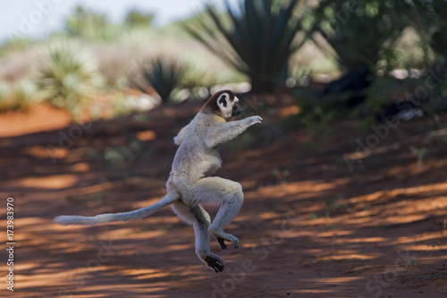 Obraz premium Larvensifaka klammert sich an einem Baum