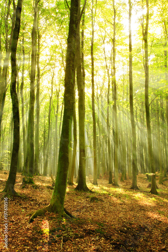© AVTG, Naklejka premium Las bukowy, promienie słoneczne przez mgłę