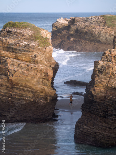 © Daniel, Naklejka premium Las Catedrales beach, Ribadeo, Galicia, Spain. Female tourist making photos surrounded by cliffs.