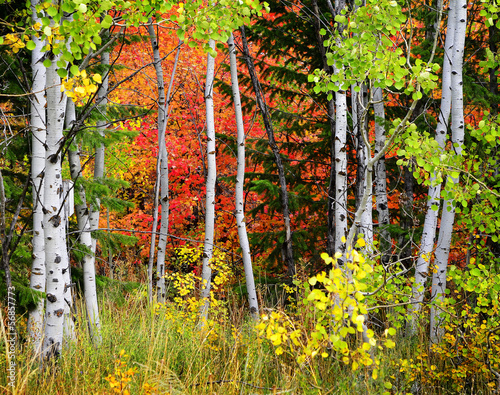 © Lane Erickson, Obraz premium Las sosnowy, osiki i sosny jesienią