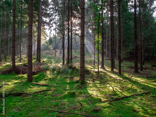Fototapeta premium LAS W CZECHACH O ZACHODZIE WIOSNĄ. ŚWIATŁO PRZEZ DRZEWA