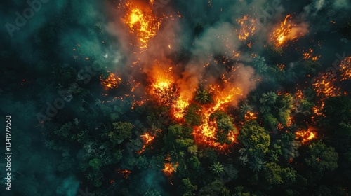 © KOSHKAROV SERGEI, Fototapeta premium Laser Fire in Forest Endangers Monkeys from Above