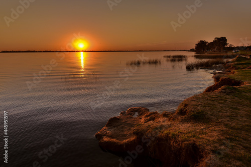 Obraz premium Last moments of the day over a lagoon with calm waters and water plants with beautiful colours in San Miguel del Monte, Buenos Aires, Argentina. Sunset.