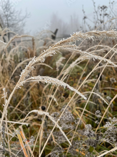 Fototapeta premium Last years grass covered with frost, very cold weather in winter