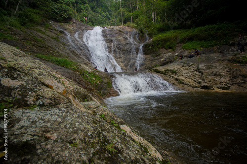 Naklejka premium Lata Iskandar, Perak, Malaysia. March 25, 2018. A lady taking a rest at a Lata Iskandar waterfall, located along a trunk road from Tapah to Cameron Highland.