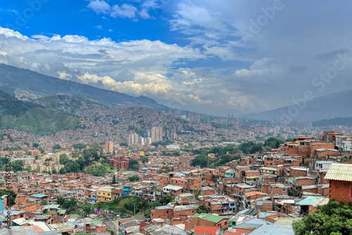 Fototapeta premium LATAM. Columbia, sityscape of Medellin. San Javier is a residential area, occupying a hilly sprawl at the western edge of Medellín. It is one of the most densely populated parts of the city