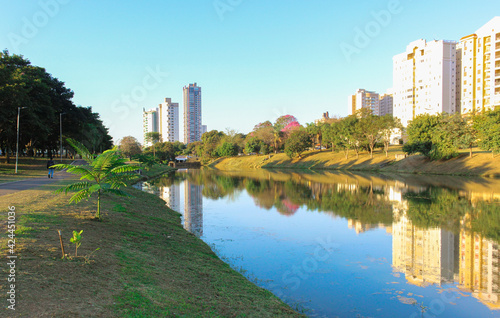 Naklejka premium Late afternoon in the ecological park (Parque Ecológico) of Indaiatuba with lake reflecting the trees and buildings.