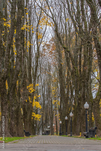 Fototapeta premium Late autumn park with benches. Fallen yellow leaves.