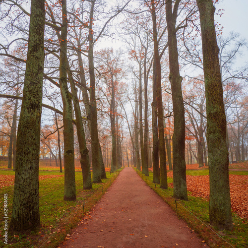 Naklejka premium Late autumn, the perspective of leafless trees in the morning in a foggy park.