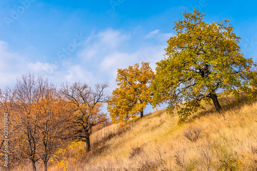 © Stanislav Ostranitsa, Fototapeta premium Late autumn - tree on a background of hills with autumn trees