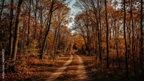 Naklejka premium Late fall afternoon with a sunlit path through the woods