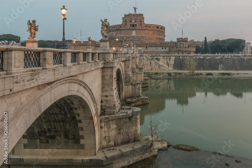 © Marco, Naklejka premium Lateral view of the Aurelius bridge with illumination over the Tiber at dawn. Stone bridge with the Castle Sant Angelo in the center of the old town of Rome. Clouds in the sky in the background