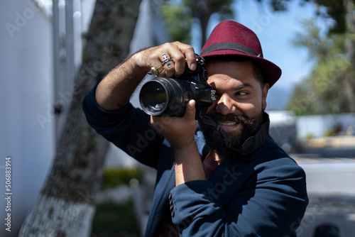© Amilciar, Obraz premium Latin American bohemian man with beard, hat and camera in hand taking pictures around the city. Career and vacation concept