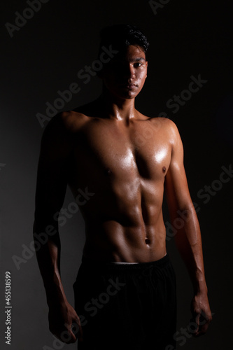 Fototapeta premium Latin and muscular man posing shirtless. strong and dark skinned man.