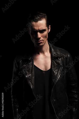 Fototapeta premium latin biker in black leather jacket posing in dark studio