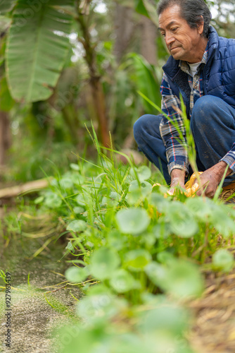 © Guillermo Spelucin, Fototapeta premium Latin farmer checking the water flow in his fish farm pond