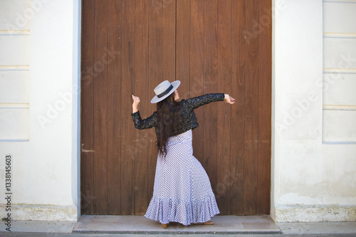 Naklejka premium Latin woman, young and beautiful dancing flamenco in front of a wooden door in a typical street of andalusia. The woman is dressed in a white ruffled dress with black polka dots, a hat and a jacket.