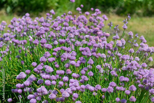 © barmalini, Naklejka premium Lato kwiat szczypiorku allium roślina w warzywo ogródzie