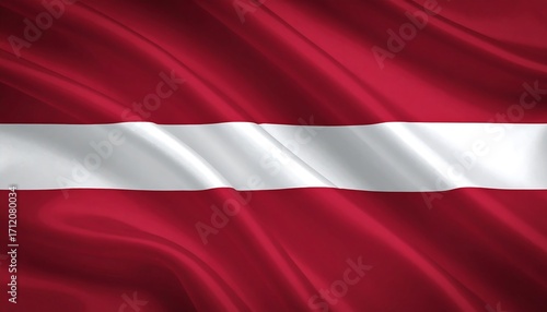 Fototapeta premium Latvia flag with deep red and white horizontal bands waving dynamically, symbolizing national pride, resilience, and cultural identity.