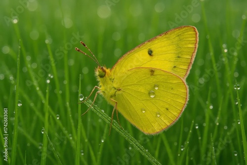 © Viktor, Fototapeta premium Latvia, Kandava, 2025-08-23, Latvijas kauss A Butterfly's Gentle Rest on a Rain-Kissed Grass Blade