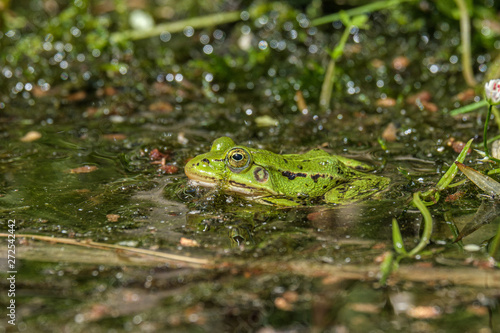 Fototapeta premium Latvian green frog resting in sun in a lake on water surface. Pelophylax kl. esculentus.