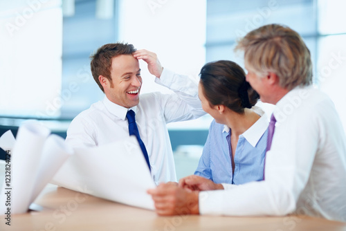 Fototapeta premium Laughing, architect and people with blueprint, discussion and collaboration...