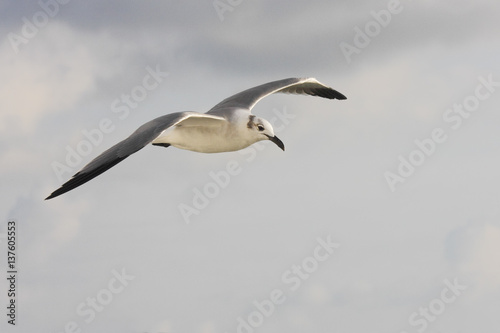 Fototapeta premium Laughing gull (Leucophaeus atricilla) flying, Bolivar peninsula, Texas, USA