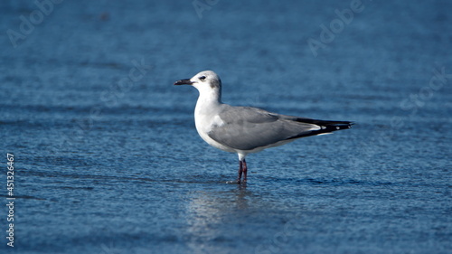 © Angela, Naklejka premium Laughing gull (Leucophaeus atricilla) wading on the beach in Las Penas, Ecuador