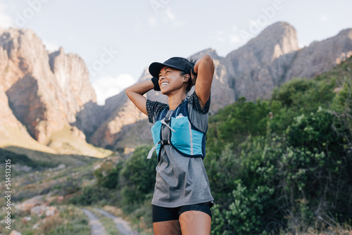 © Artem Varnitsin, Obraz premium Laughing woman in sportswear relaxing during hike. Smiling female in wild terrain looking away.
